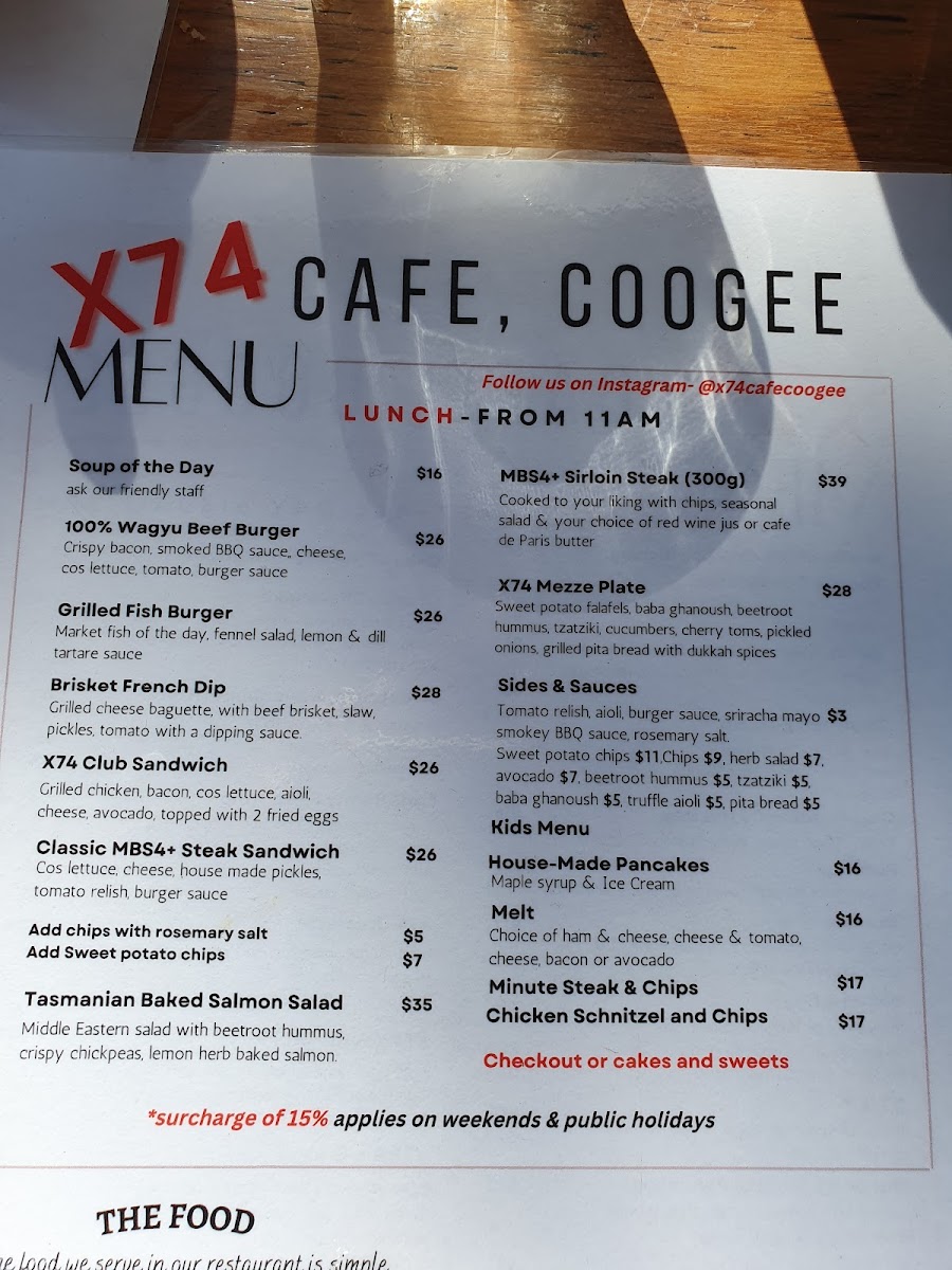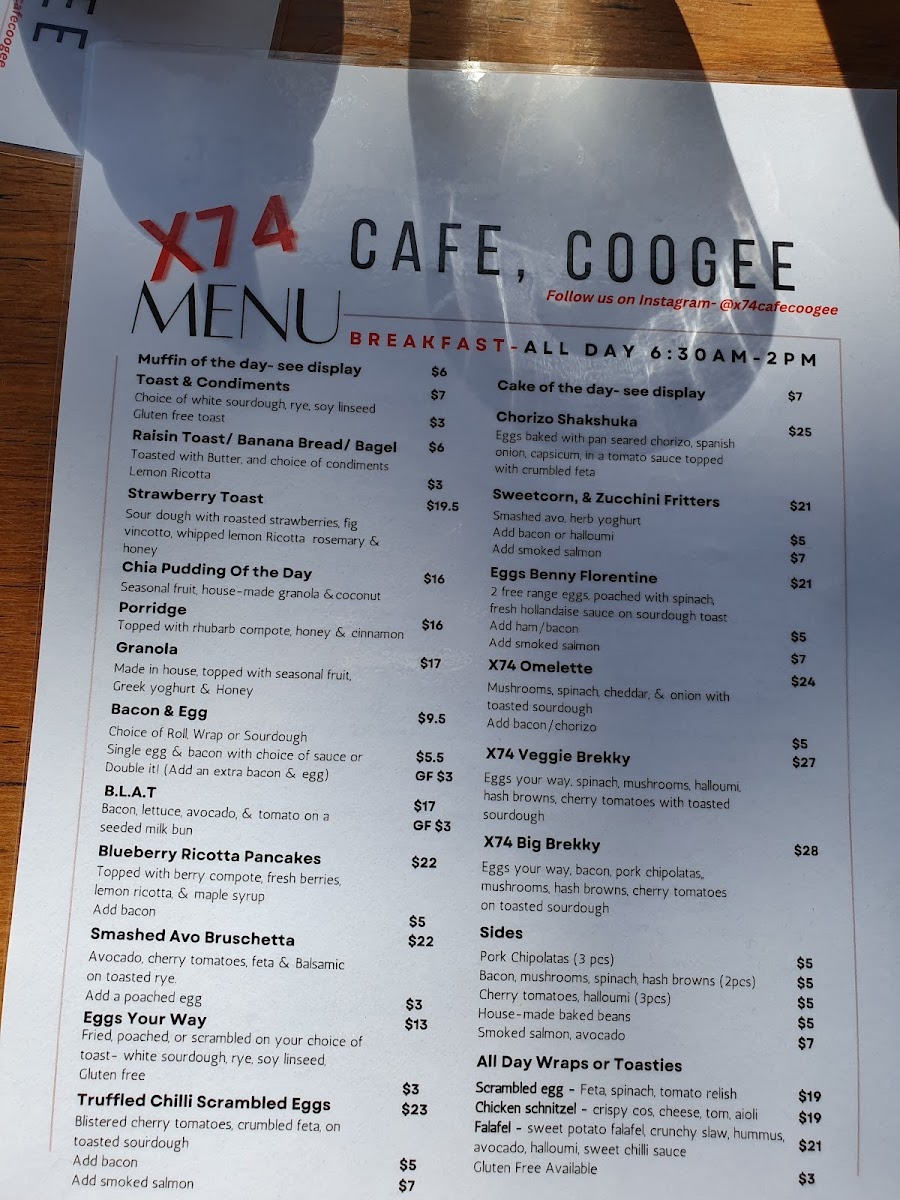 The menu at X74 Cafe in Coogee offers a vibrant range of options for all tastes and times of day. For those looking to refresh, there are a variety of cold drinks like Coconut Water, Ginger Kombucha, and Watermelon Kombucha. If you prefer something hot, choose from their Long Black, Matcha Latte, or indulge in a comforting Hot Milo. Breakfast options are enticing, featuring dishes like Porridge, Eggs Benny Florentine, and the hearty Chorizo Shakshuka. If you're after something lighter, their X74 Omelette or a Ham & Cheese Croissant might hit the spot. For lunch, the X74 Club Sandwich and Grilled Chicken Burger are popular picks, while more substantial meals like the MBS4+ Sirloin Steak (300g) are sure to satisfy. Their range of smoothies, including the refreshing Açaí Smoothie and indulgent Snickers Smoothie, complement the menu beautifully. Additionally, the kids’ menu is well-loved with options like Chicken Schnitzel and Chips and Pancakes. Don't miss the all-day wraps or toasties, with crowd favorites like Chicken Schnitzel and Falafel. Pair these with one of their fresh Jiva Tonic Shots or a rich Milkshake in flavors like Nutella or Caramel. Finally, their Lunch Salads-including the Classic Greek Salad and Healthy Bowl Salad-offer lighter, wholesome options. Whether you're popping in for a quick snack or enjoying a full meal, the variety and quality of the offerings at X74 Cafe ensure there's something for everyone.